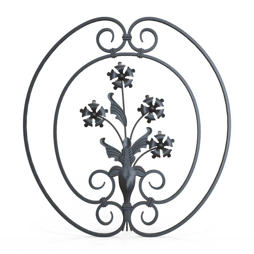 Tall handmade wrought iron side gate with solid 16mm round rail bars and hammered effect gate frame, decorative iron flower panel and lock.